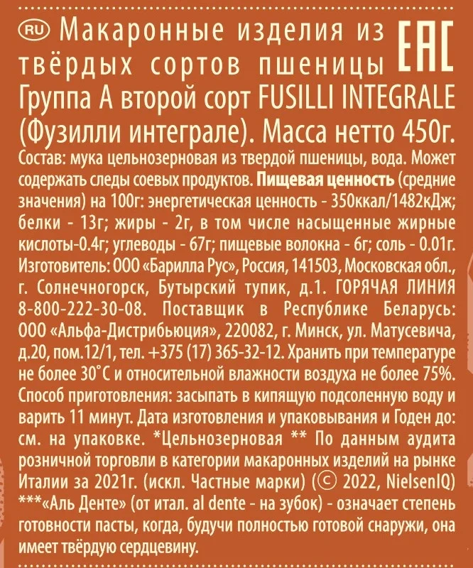 Макаронные изделия Barilla Fusilli Integrale цельнозерновые, 450г