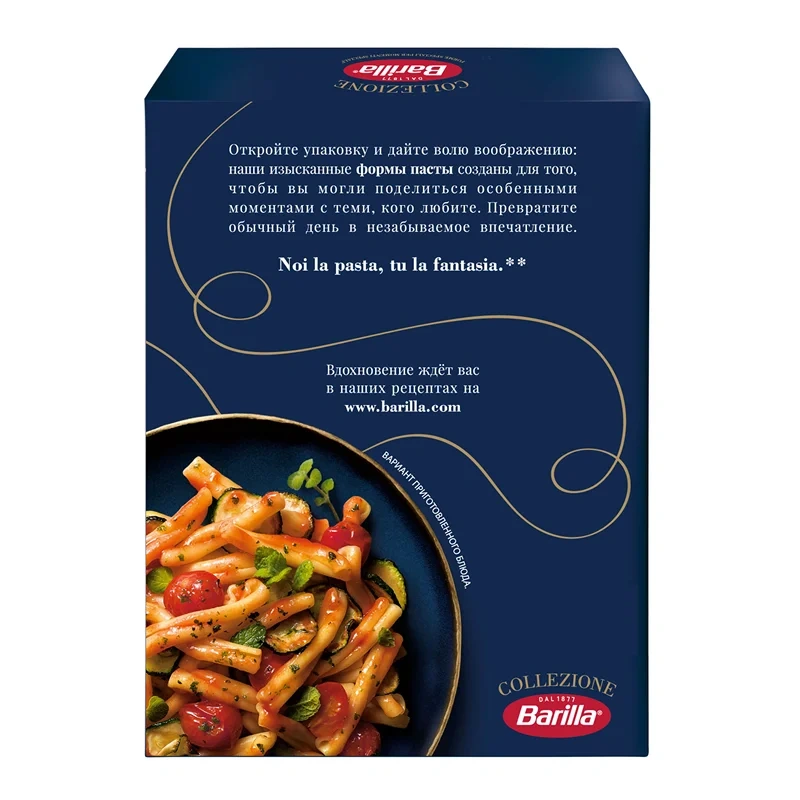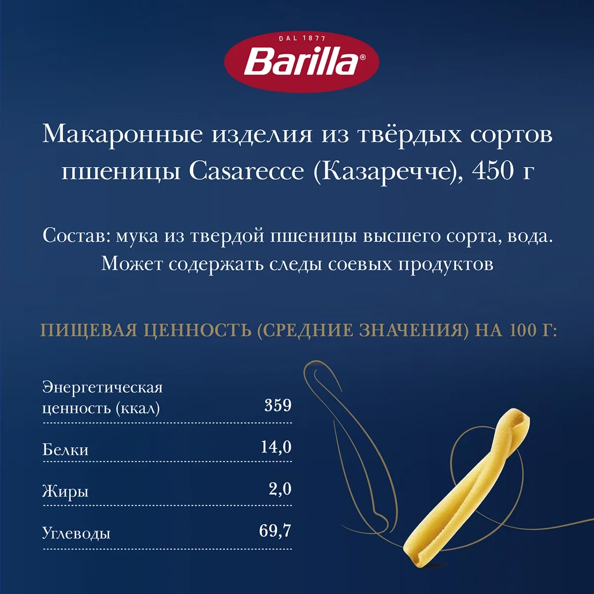 Макароны Казаречче Barilla созданы для того, чтобы вы смогли разделить особенные моменты с теми, кого любите! Ведь даже само название в переводе с итальянского означает домашнее. Casarecce – это изысканная короткая паста, похожая на перекрученную трубочку. Благодаря своей изогнутой поверхности она позволяет идеально удерживать соус, что сделает вкус вашего блюда еще более насыщенным. Добавьте средиземноморские ингредиенты, такие как цуккини, баклажаны, помидоры, сыр – и ваше по-итальянски вкусное блюдо готово!