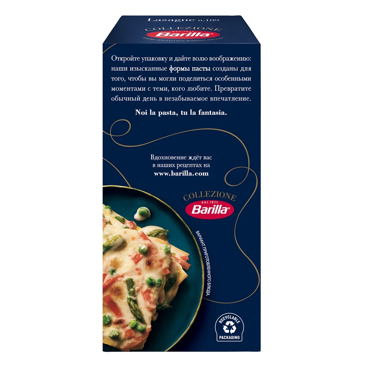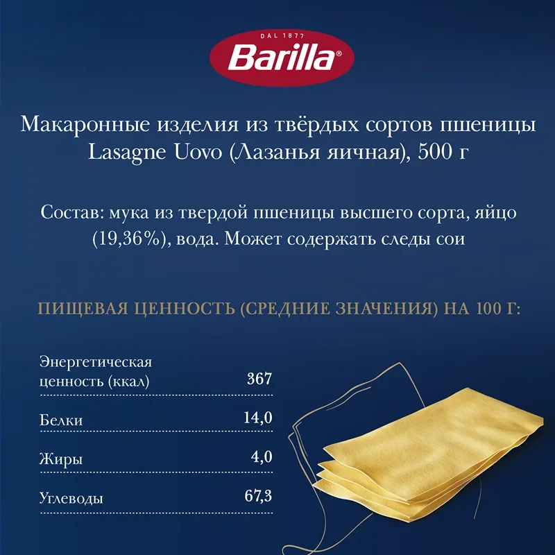 Лазанья Barilla Lasagne All’Uovo – основа для вкусного и сытного блюда, которое можно приготовить с самыми разными начинками. Попробуйте традиционный мясной фарш, разнообразные овощи, грибы или морепродукты – всё зависит только от вашей кулинарной фантазии. Итальянская паста Lasagne All'Uovo производится из твёрдых сортов пшеницы с добавлением яиц. Яичные макароны отлично удерживают форму при запекании. В процессе приготовления тонкие гладкие листы лазаньи равномерно пропитываются соусом, делаются мягкими и легко нарезаются на порции. Паста не требует предварительной варки: соберите ингредиенты в форме для запекания и отправьте в духовку всего на 20 минут – ароматное и сочное блюдо готово.
