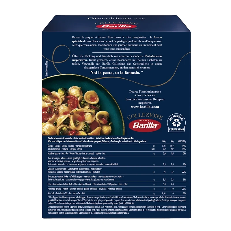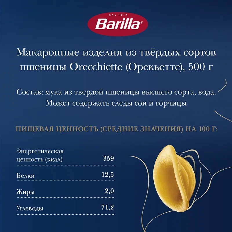 Макароны Barilla Orecchiette представляют собой одну из разновидностей традиционной итальянской пасты. Они имеют ребристую поверхность и углубления внутри и за характерную форму получили название макароны-ушки. Barilla Ореккьетте прекрасно сочетаются с мясом, рыбой, птицей и овощами. Эта паста помогает наиболее полно раскрыть насыщенный вкус и богатый аромат соуса, так как благодаря особой текстуре и внутренней полости удерживает его и не позволяет стекать. Итальянские макароны производятся из твёрдых сортов пшеницы и воды и не содержат искусственных добавок и консервантов. Они не теряют форму во время варки и не слипаются.
