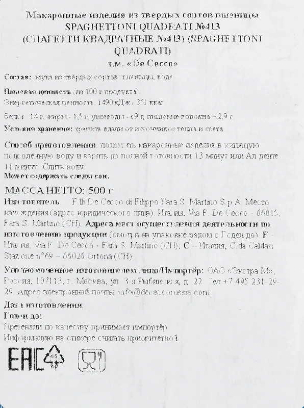 Макароны De Cecco Спагеттони квадратные изготавливаются с соблюдением традиционных технологий производства итальянского региона Абруццо. Изделие состоит из муки особого помола твердых сортов пшеницы. Благодаря рецептуре сохраняются полезные вещества, а готовый продукт проявляет прекрасные вкусовые качества и аромат. Макароны имеют низкий гликемический индекс и не нарушают нормальный уровень глюкозы в крови за счет высокого содержания сложных углеводов, которые усваиваются в течение нескольких часов. После приема пищи долгое время остается ощущение сытости и подъема сил. Спагеттони необходимо варить в течение 13 минут в кипящей воде. Для степени готовности аль денте, когда макароны слегка недоварены, рекомендуется ждать всего 11 минут. Блюдо сочетается с такими сырными соусами, как карбонара и аматричиана.