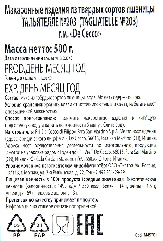 Макароны De Cecco Тальятелле производятся в Центральной Италии и оптимально сочетаются с блюдами на основе кремообразных соусов из мягких сыров, сливок, мяса и помидоров, которые легко впитываются и растекаются по поверхности. Продукт изготавливается по традиционным итальянским рецептурам из высококачественных твердых сортов пшеничной муки с необходимым количеством очищенной питьевой воды. Крупные изделия имеют широкую плоскую форму и собраны в специальные гнезда.