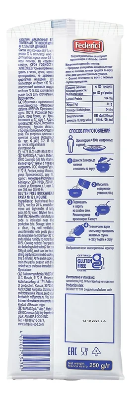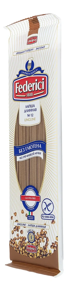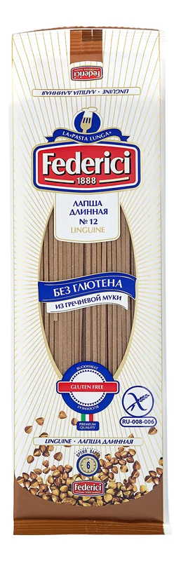 Гречневая лапша Federici богата витаминами B1 и B2, в ней много минеральных веществ и белка. Гречневая лапша помогает нормализовать пищеварение, сокращает жировые отложения, снижает холестерин и артериальное давление, тем самым улучшая метаболизм.отличное решение для людей с непереносимостью глютена. Как известно, гречка не содержит глютена, но Отличается высоким содержанием витаминов, белков и минералов, столь полезных для здоровья.Лапша без глютена – низкокалорийный продукт, ничуть не уступающий по вкусовым качествам своему пшеничному аналогу. Прекрасно подходит в качестве гарнира к основным блюдам.