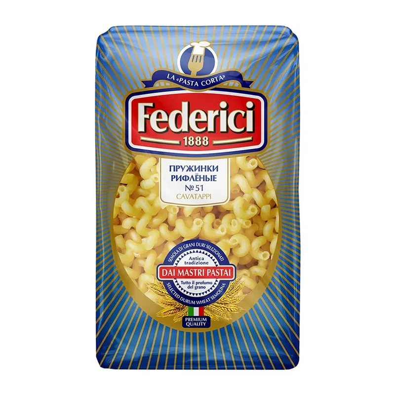 Макароны Federici Cavatappi Пружинки рифленые — оптимальный вариант для ежедневного рациона. Приготовление такой пищи требует минимум времени и усилий, при этом с помощью различных соусов и пряностей можно создать разнообразное меню, включающее блюда русской и средиземноморской кухонь. Клейковина, которая присутствует в муке, не дает макаронам развариваться. Продукт производится в России из твердых сортов пшеницы в соответствии с принятыми нормативами. В его составе содержатся исключительно натуральные компоненты, благодаря которым кушанье получается сытным и полезным, придает силы и повышает выносливость организма. Чтобы обеспечить здоровое полноценное питание, в меню обязательно надо включать продукты из твердых пшеничных сортов.