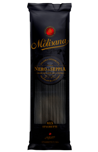 Спагетти La Molisana с чернилами каракатицы производятся из питьевой воды и высокосортной пшеничной муки. Продукт богат клетчаткой и витаминами, положительно влияющими на настроение и самочувствие. Черный цвет спагетти сохраняется в процессе термической обработки. Блюдо можно заправлять сливочными и сырными, овощными, грибными и другими видами соусов, а также подавать к мясу и рыбе. Паста имеет классический вкус спагетти, дополненный морепродуктами. Варить ее следует в течение 9 минут в слегка подсоленной воде, чтобы получить макароны al dente.