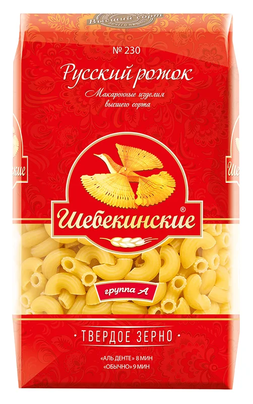 Макароны Шебекинские Русский рожок № 230, 450 г не развариваются, не прилипают к стенкам посуды, идеально сочетаются с различными мясными блюдами, овощными салатами и сырами. Этот продукт станет незаменимым гарниром на каждый день и к праздничному столу. Макароны изготовлены из твердых сортов пшеницы, в составе нет консервантов и красителей. Вы можете употреблять их каждый день и не волноваться за фигуру. Варить макароны недолго – 10-12 минут в кипящей подсоленной воде. Затем вы можете их обжарить или смешать с любым соусом, который любите вы и ваша семья.