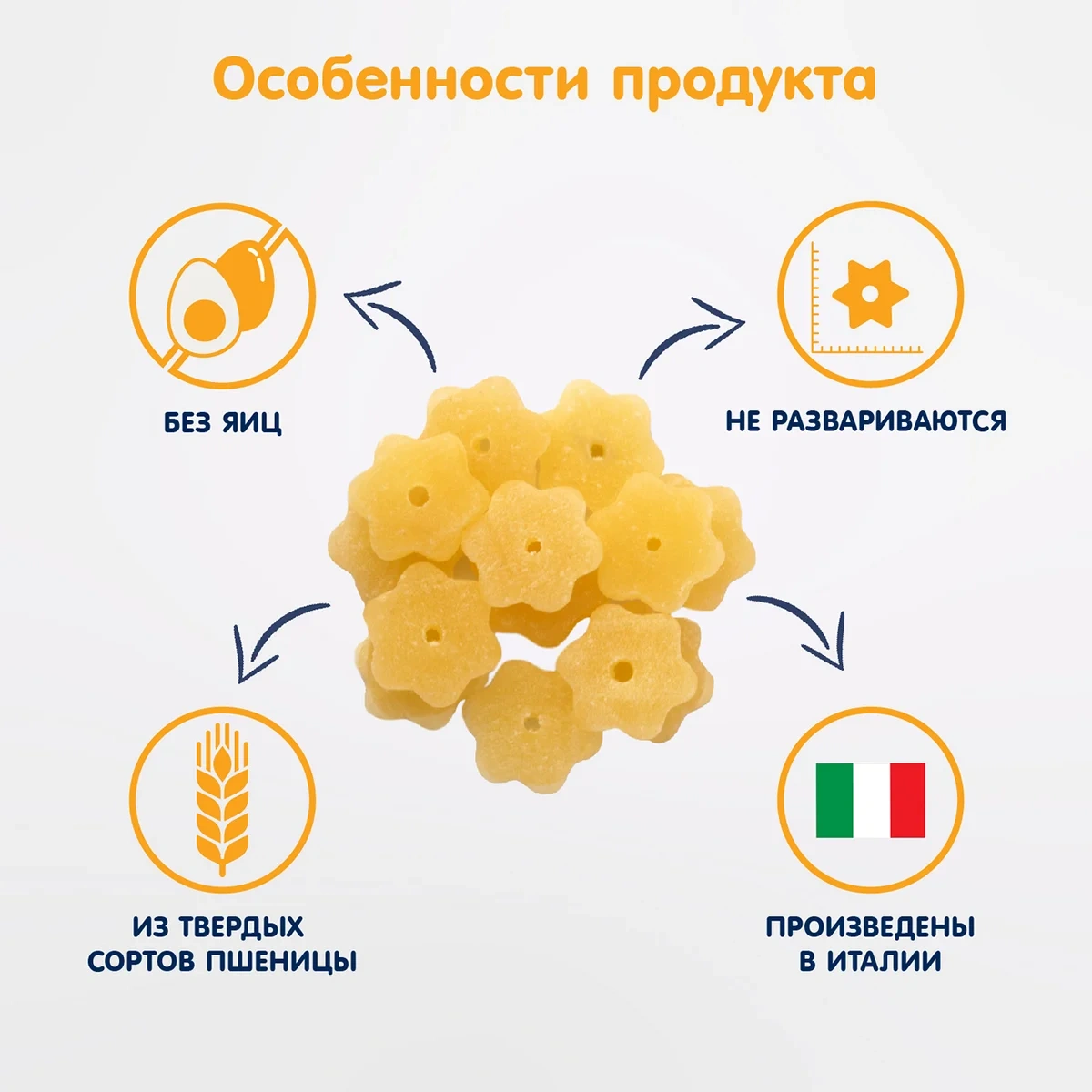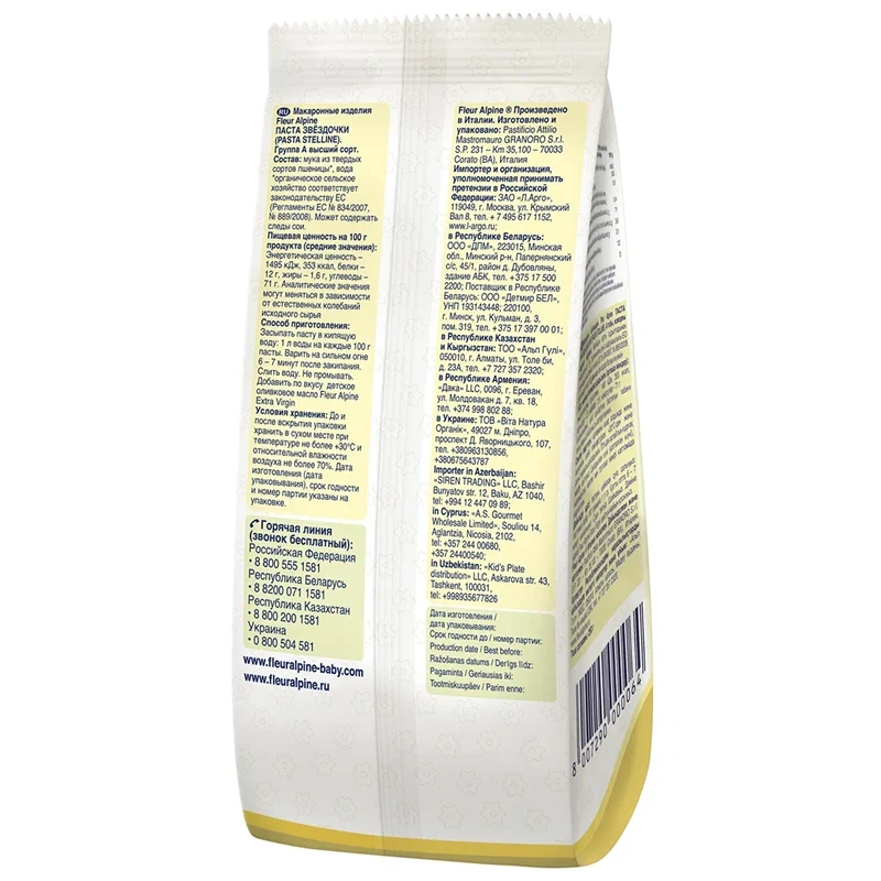 Маленькие итальянские макароны звездочки (Stelline) Fleur Alpine из твердых сортов пшеницы: - Не развариваются, прекрасно сохраняют форму, обладают превосходными вкусовыми качествами; - В составе только мука из твердых сортов пшеницы и вода; - Отличный вариант для первого знакомства ребенка с настоящей итальянской пастой; - Органический продукт. Важно: могут содержать следы сои. При вводе новых продуктов в рацион ребенка требуется консультация педиатра. Макароны звездочки - продукт для всей семьи, который родители могут предложить малышу, когда в его меню уже входят блюда общего стола. Добавьте немного оливкового масла первого холодного отжима Fleur Alpine в свежеприготовленную пасту, и ребенок обязательно оценит новое для него блюдо. Макароны-звездочки незаменимы для варки супа. Маленькие макароны в форме звездочек не слипаются в процессе варки и не требуют промывания. Они прекрасно подходят для всей семьи, но благодаря миниатюрному размеру и привлекательному оформлению упаковки особенно понравятся малышам. Могут использоваться для приготовления супов и основных блюд. Продукция бренда Fleur Alpine изготавливается на лучших специализированных предприятиях Европейского Союза без добавления витаминно-минеральных комплексов, пальмового масла, загустителей, соли, консервантов, красителей и ароматизаторов. Все ингредиенты поступают из органических фермерских хозяйств – вот почему готовые продукты получаются очень вкусными и абсолютно безопасными.