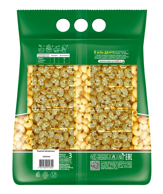 Классические макаронные изделия, изготовленные из твердой пшеницы, в удобной фасовке 3кг. Натуральный продукт из твердых сортов пшеницы. Подходит для приготовления гарниров, запеканок и супов. Универсальный ингредиент для сытного обеда и легкого ужина, прекрасно сочетается с овощами, мясом и рыбой.
