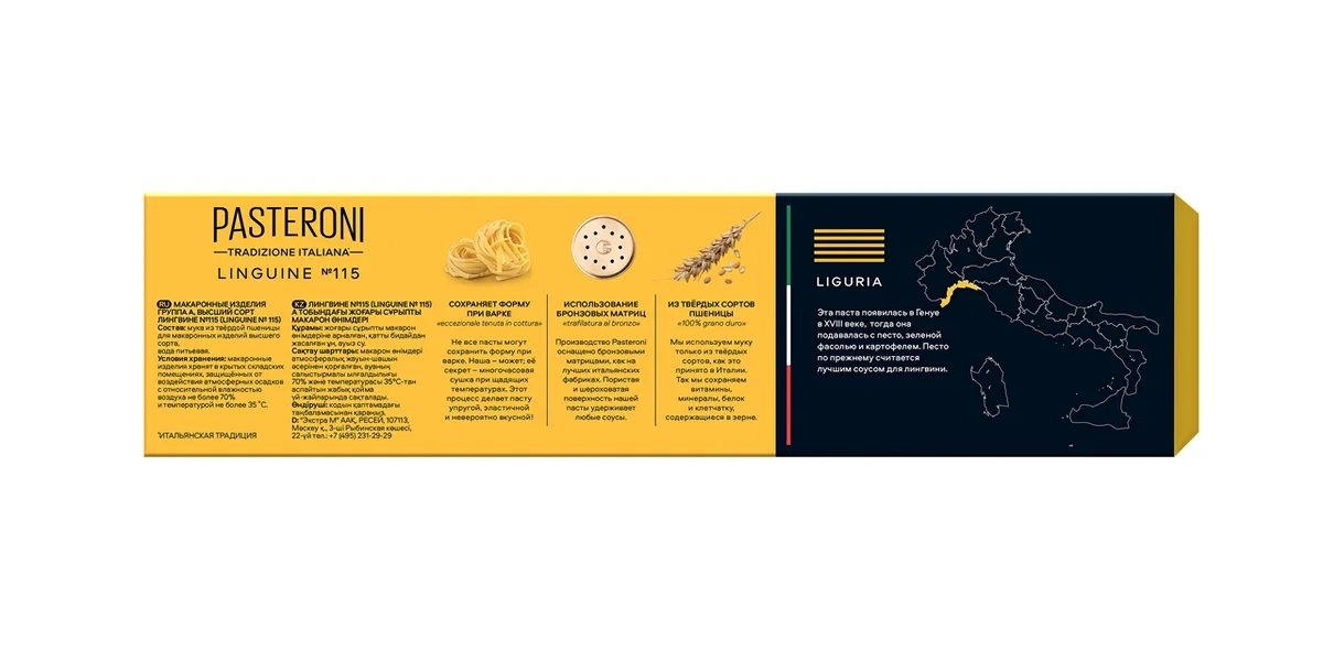 Спагетти широкой плоской формы родом из региона Лигурия, где еще в XVIII веке она подавалась с соусом песто, зеленой фасолью и картофелем. Качество макарон и сохранение их вкуса обеспечивает медленная сушка при низких температурах.
