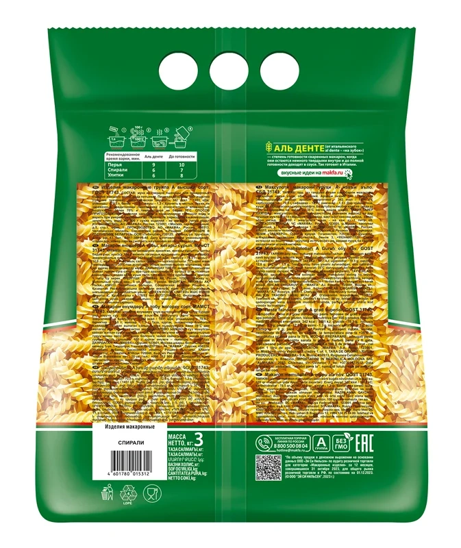 Макароны Makfa спирали высший сорт, 3кг
