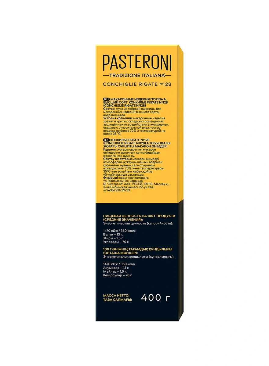 Макароны Pasteroni Конкилье Ригате №128, 400г