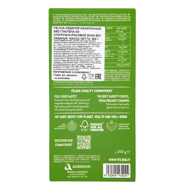 Макароны Felicia лазанья из кукурузно-рисовой муки, 250г