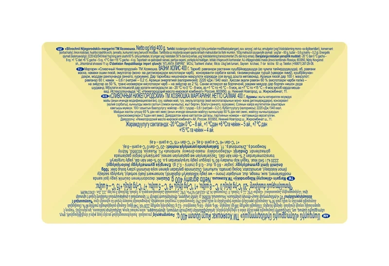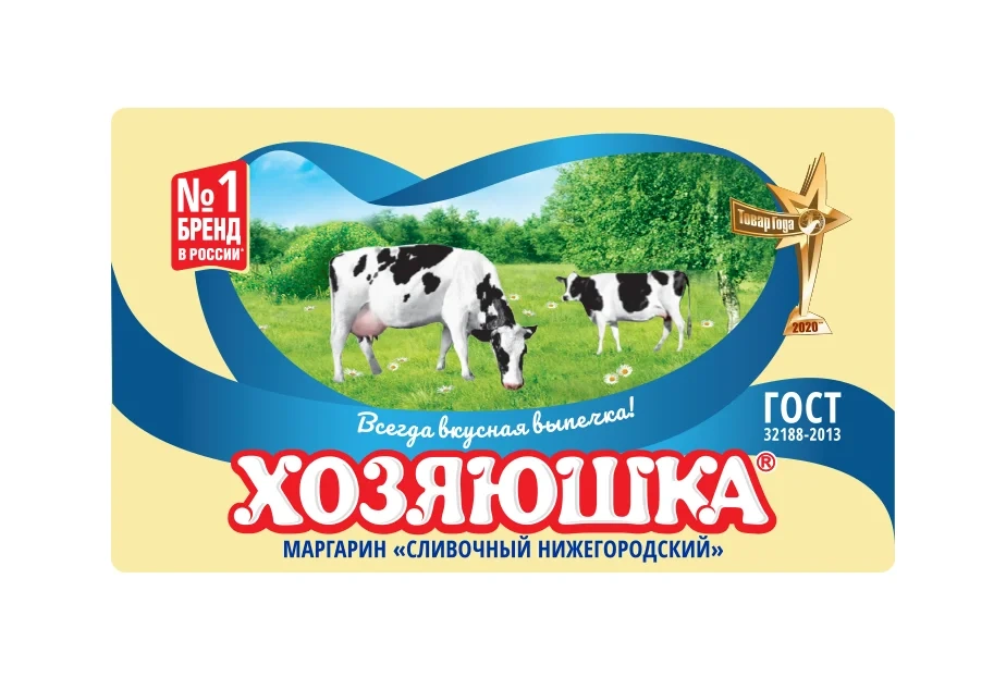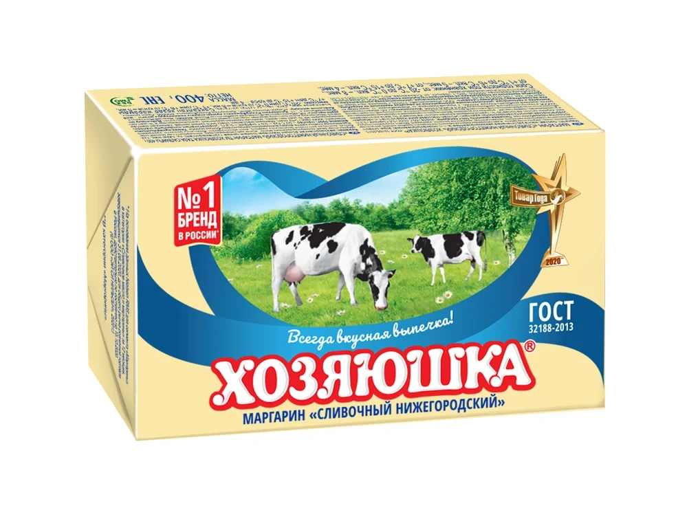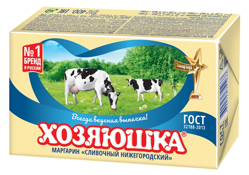 Маргарин Хозяюшка Нижегородский сливочный, 400 г, приготовленный на основе растительных масел и воды, имеет однородную консистенцию и легкий сливочный вкус. Этот продукт широко применяется в кулинарии. Для выпечки он просто незаменим. После добавления маргарина в тесто оно становится объемным и нежным. Готовая выпечка получается воздушной, а процесс ее очерствения значительно замедляется. Маргарин можно использовать и для обжаривания различных продуктов на сковороде.