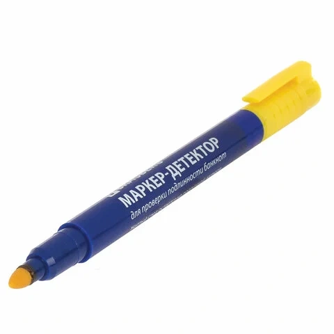 Предназначен для быстрой проверки подлинности банкнот. На проверяемую банкноту необходимо нанести любую метку маркером. Если метка приобретет светло-желтый оттенок - купюра подлинная, если метка потемнела - купюра фальшивая. Характеристики Для быстрого определения подлинности банкнот. Высокая точность результата. Реагирует на химический состав краски и бумаги банкнот. Работает с большинством видов мировых валют: рубли, доллары, евро. Круглый наконечник. Увеличенный объем чернил. Артикул производителя: 151245. Штрих-код: 4606224169705. Производитель: Китай.