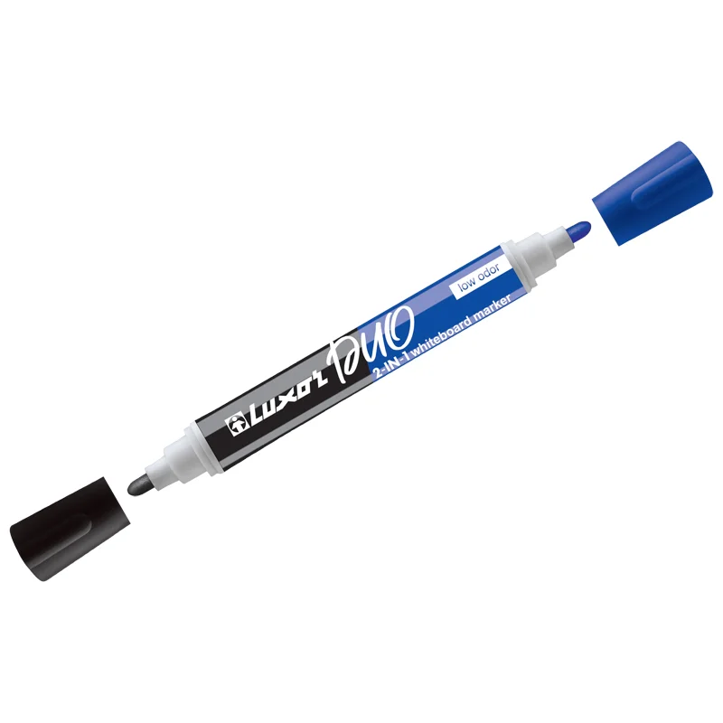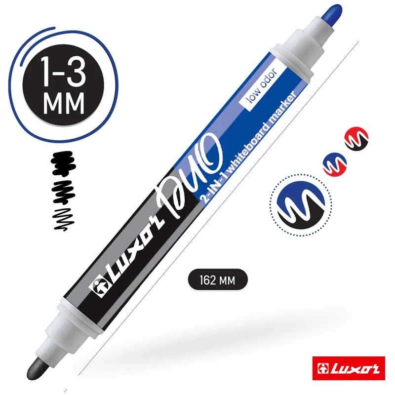 Маркер двухсторонний Luxor 'Duorite' предназначен для использования на досках с магнитно-маркерной поверхностью. Чернила на спиртовой основе быстро высыхают на поверхности доски. След от маркера легко удаляется сухой губкой. Яркая линия письма. Круглая форма наконечника. Уникальное предложение - два цвета в одном маркере. Ширина линии письма 1-3 мм. Цвет чернил - черный/синий.