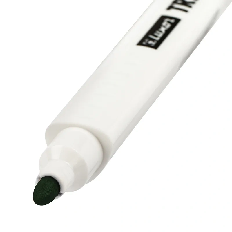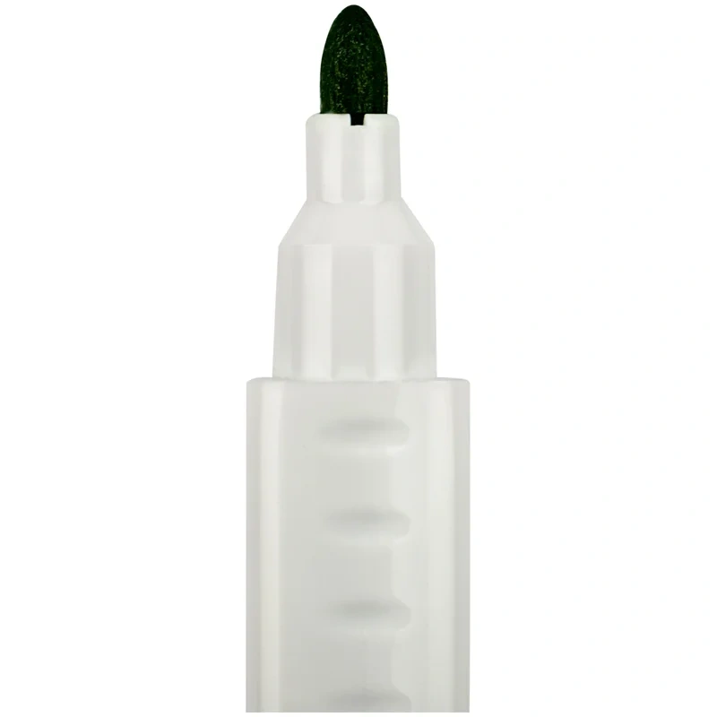 Прочный фибровый наконечник не западает в корпус и сохраняет форму на протяжении всего срока службы маркера. След от маркера легко удаляется сухой губкой. Длина линии письма - до 700 метров. Пулевидный наконечник позволяет наносить яркие и однородные линии толщиной 2.5 мм. Цвет чернил - зеленый. Упаковка: картонная коробочка по 12 штук.