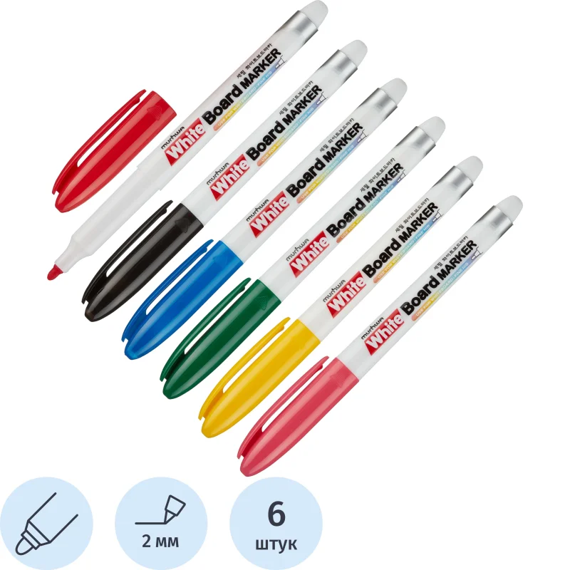 Высококачественные маркеры Whiteboard от бренда MunHwa для белых магнитно—маркерных досок. Маркеры обладают яркими и насыщенными цветами и сохраняют надолго яркость цвета. Легко стираются с поверхности сухой губкой, не оставляют следов и разводов. Пишут мягко без скрипа и не оставляют царапин. Чернила на спиртовой основе высыхают на поверхности доски в течении 1–2 секунд. Прочный фибровый наконечник не западает в корпус и сохраняет форму на протяжении всего срока службы маркера. Круглый наконечник позволяет наносить яркие и однородные линии толщиной 2 мм. В наборе 6 цветов: розовый, красный, желтый, зеленый, синий, черный. Маркеры отлично подойдут для проведения ярких презентаций в офисе, так и для детского творчества.