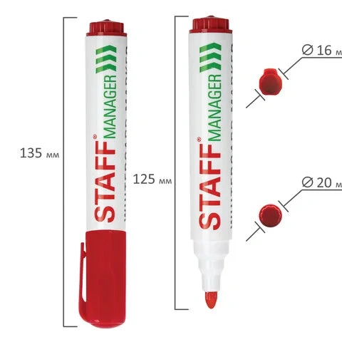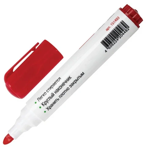 Маркер для доски красного цвета обладает круглым пластиковым корпусом диаметром 20 мм. Наконечник круглой формы обеспечивает толщину линии письма 5 мм, что позволяет писать крупным шрифтом, который будет хорошо виден. Благодаря спиртовой основе чернила быстро высыхают и не оставляют разводов, легко стираются сухой губкой. Изделие не перезаправляется. Цвет колпачка соответствует цвету чернил.