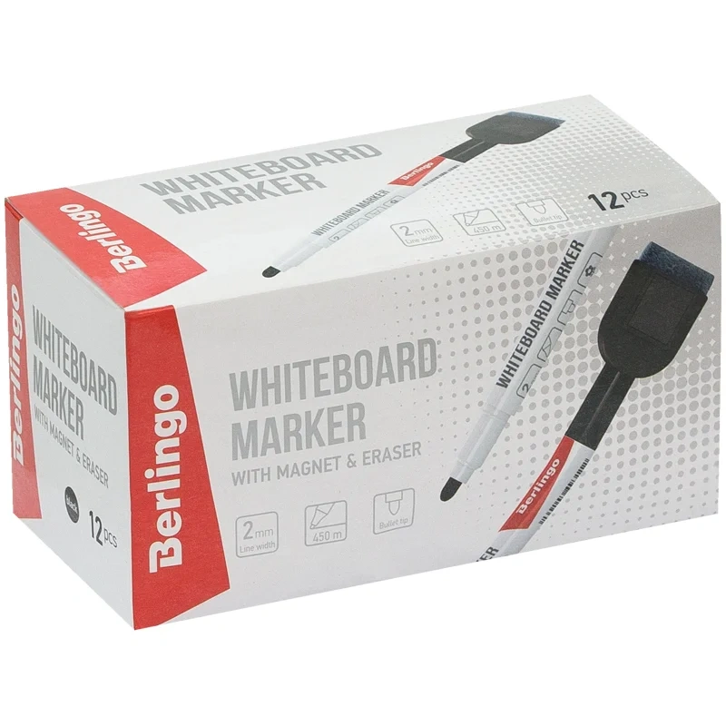Предназначен для письма на досках с магнитно-маркерной поверхностью. Чернила на спиртовой основе легко стираются сухой губкой для досок. Закругленный пишущий узел. Ширина линии – 2 мм. Длина непрерывной линии – 450 м. Колпачок с магнитом.