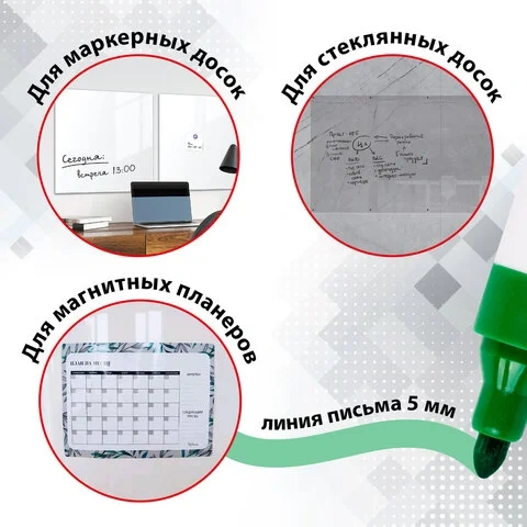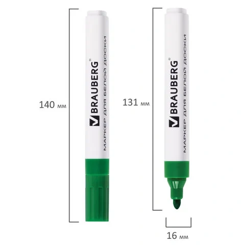 4 цвета в наборе: черный, красный, синий, зеленый. Круглый корпус из пластика, диаметр которого 16 мм. Наконечник круглой формы обеспечивает толщину линии письма 5 мм, что позволяет писать крупным шрифтом, который будет хорошо виден. Основа чернил - водная. Чернила быстро высыхают и не оставляют разводов, легко стираются сухой губкой и не высыхают с открытым колпачком в течение нескольких дней. Изделие не перезаправляется. Цвет колпачка соответствует цвету чернил
