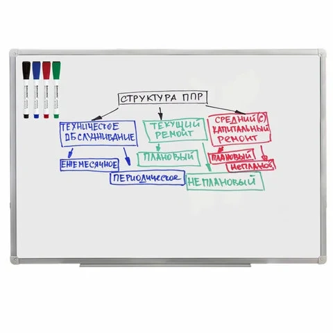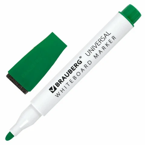 В наборе 4 маркера для доски, заправленные чернилами черного, красного, синего и зеленого цветов. Колпачок маркера оснащен магнитом для крепления к любой металлической поверхности и губкой для быстрой корректировки текста во время написания.
