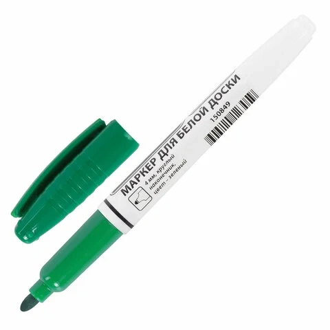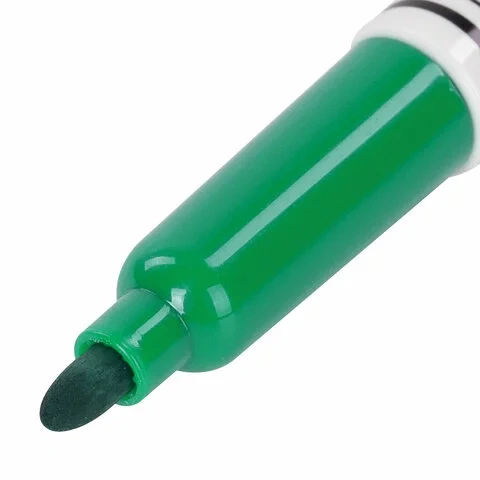 Маркер для доски зеленого цвета обладает круглым пластиковым корпусом диаметром 12 мм. Наконечник круглой формы обеспечивает толщину линии письма 4 мм, что позволяет писать крупным шрифтом, который будет хорошо виден. Благодаря спиртовой основе чернила быстро высыхают и не оставляют разводов, легко стираются сухой губкой. Изделие не перезаправляется. Цвет колпачка соответствует цвету чернил.