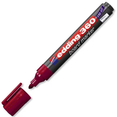 Маркер Edding 360 можно использовать на магнитно—маркерных досках, а также на флипчартах. Круглый наконечник. Пластиковый корпус. Толщина линии письма: 1.5–3 мм. Цвет: красный. Стирается сухой губкой. Чернила на спиртовой основе. Производство — Германия.