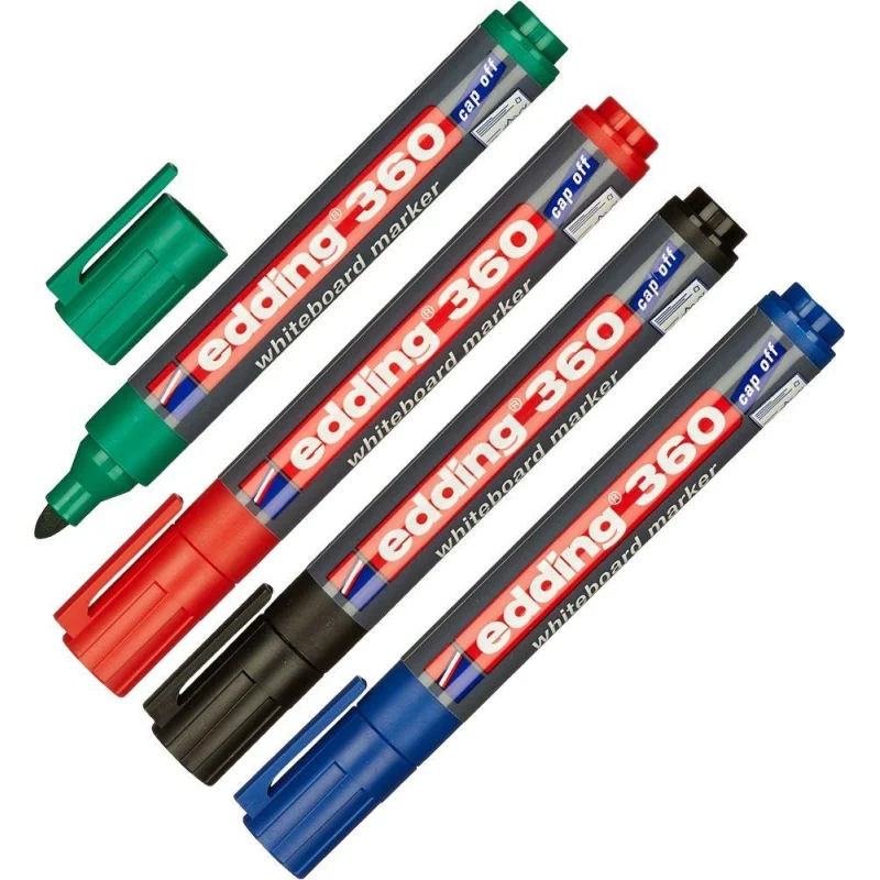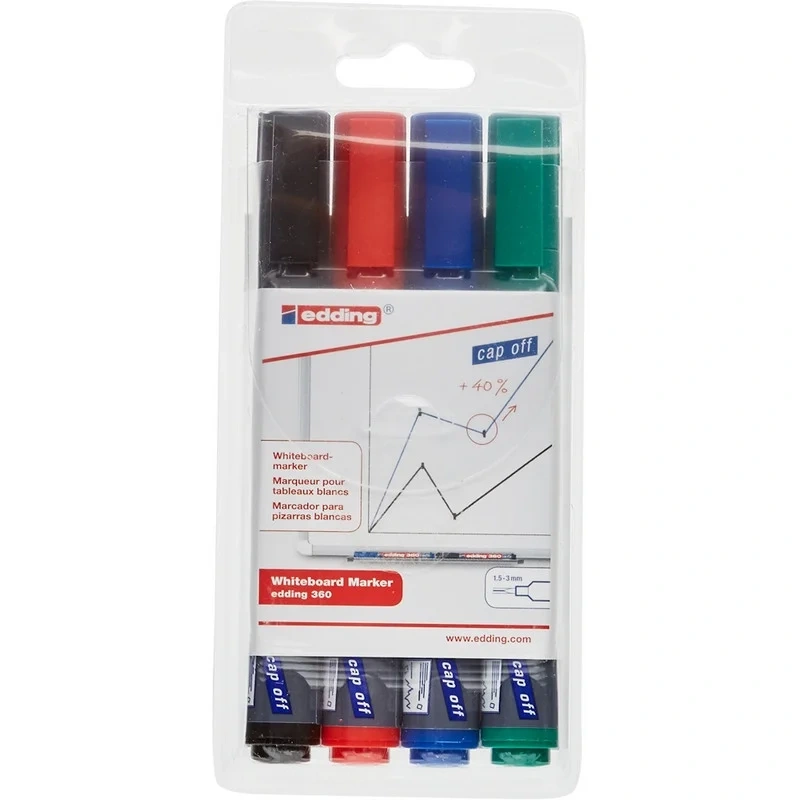Набор маркеров для досок Edding e-360 /4S с технологией «cap off». Данные маркеры можно использовать на магнитно маркерных досках, а так же на флипчартах. Размеры маркера: диаметр 16 мм, длина 137 мм. Круглый наконечник. Пластиковый корпус. Толщина линии письма: 2.2 мм. Цвета: черный, синий, красный, зеленый. Размер упаковки 168×80×16 мм. Стираются сухой губкой. Производство — Германия. Чернила на спиртовой основе.