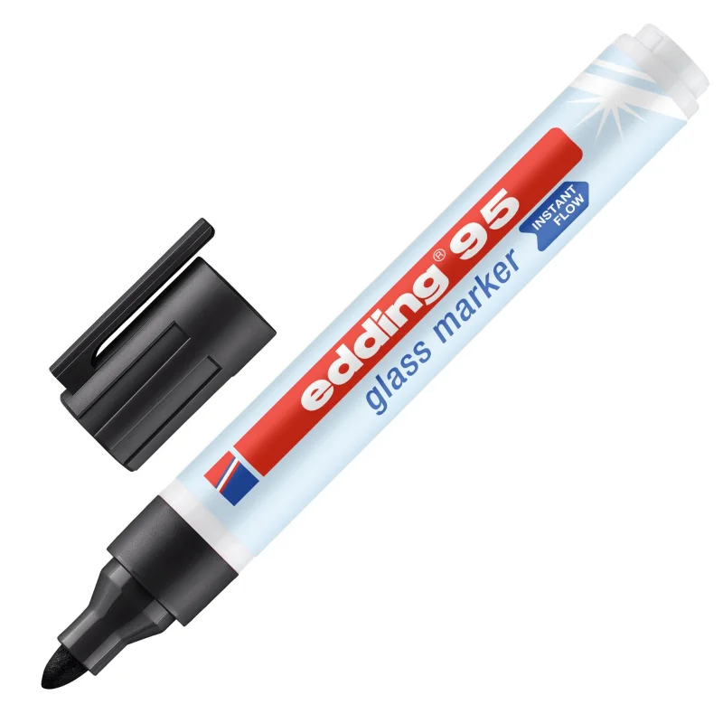 Маркер для стеклянных досок в пластиковом корпусе. Конусообразный наконечник обеспечивает толщину линии от 1.5 до 3 мм. Цвет — черный.