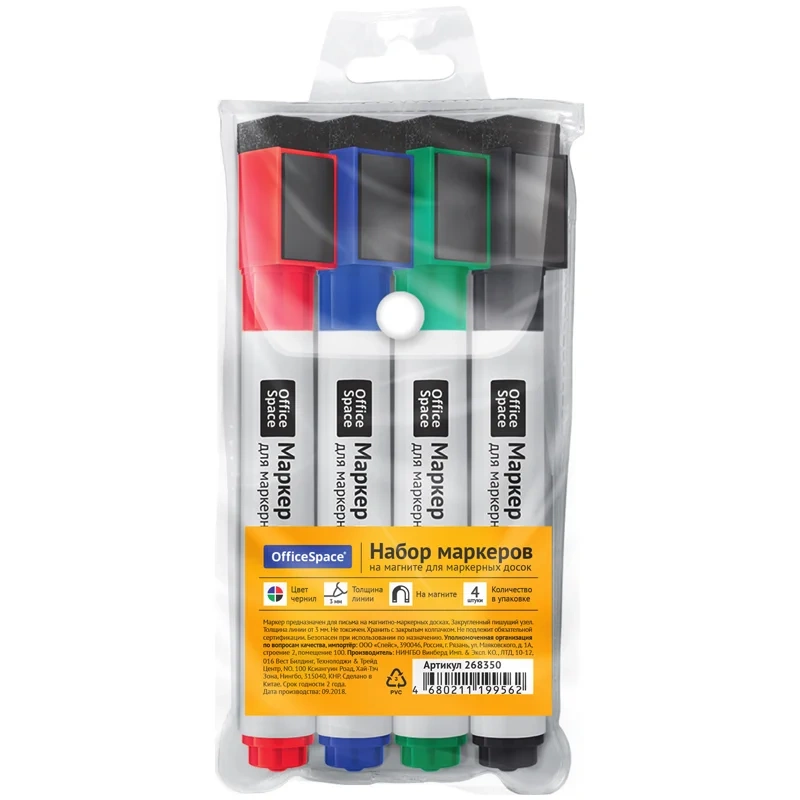 Маркер для досок Officespace на магнитазх набор 4 цвета, 3мм, пулевидный наконечник