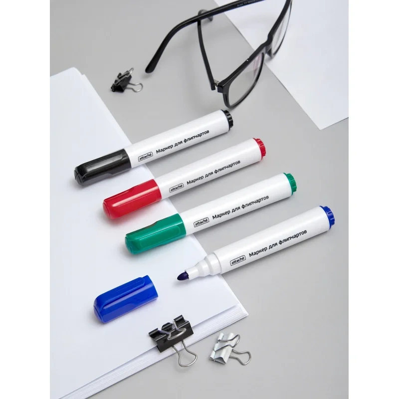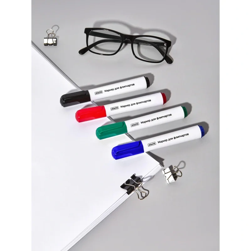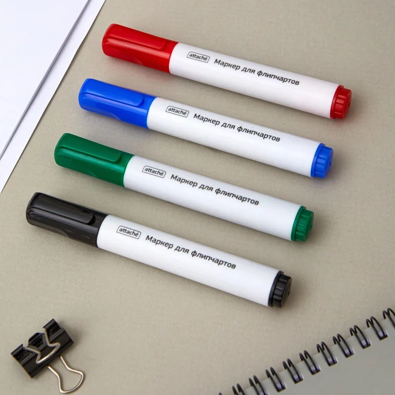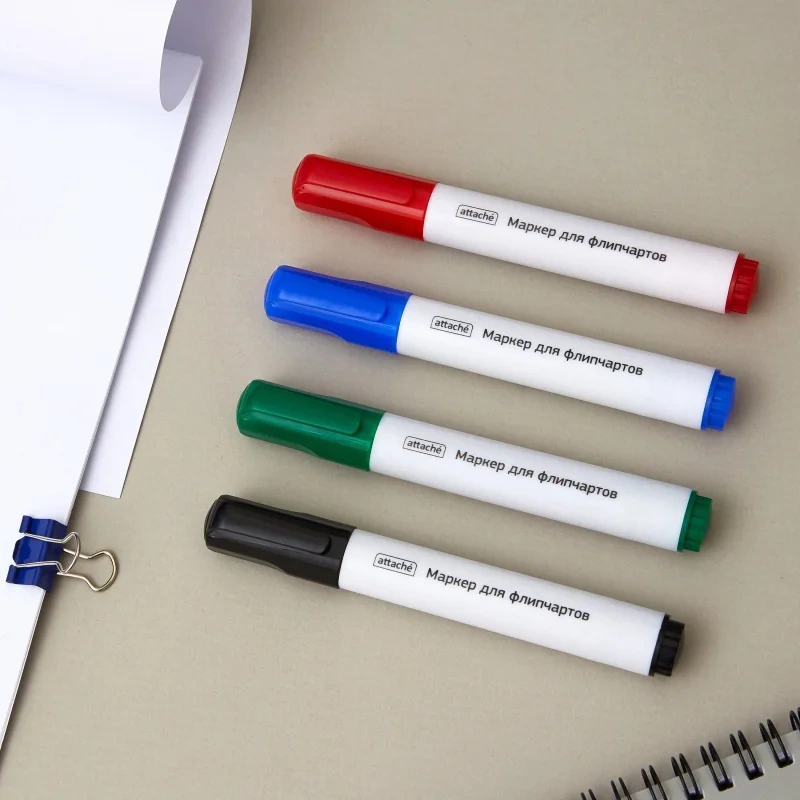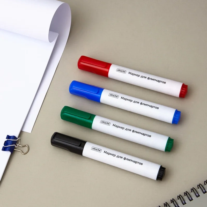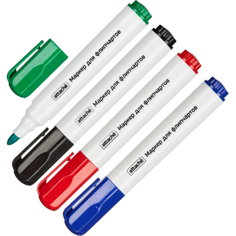 Набор маркеров для бумажных флипчартов Attache состоит из 4-х маркеров черного, синего, красного и зеленого цветов. Маркеры заполнены чернилами на водной основе. Чернила обладают насыщенным цветом и позволяют создавать надписи, не просачивающиеся сквозь бумагу. Смываются водой с большинства поверхностей. Круглый наконечник позволяет проводить линии толщиной 2-3 мм. Снятый колпачок не потеряется благодаря тому, что во время работы его можно надевать на верхнюю часть маркера. Нетоксичны.