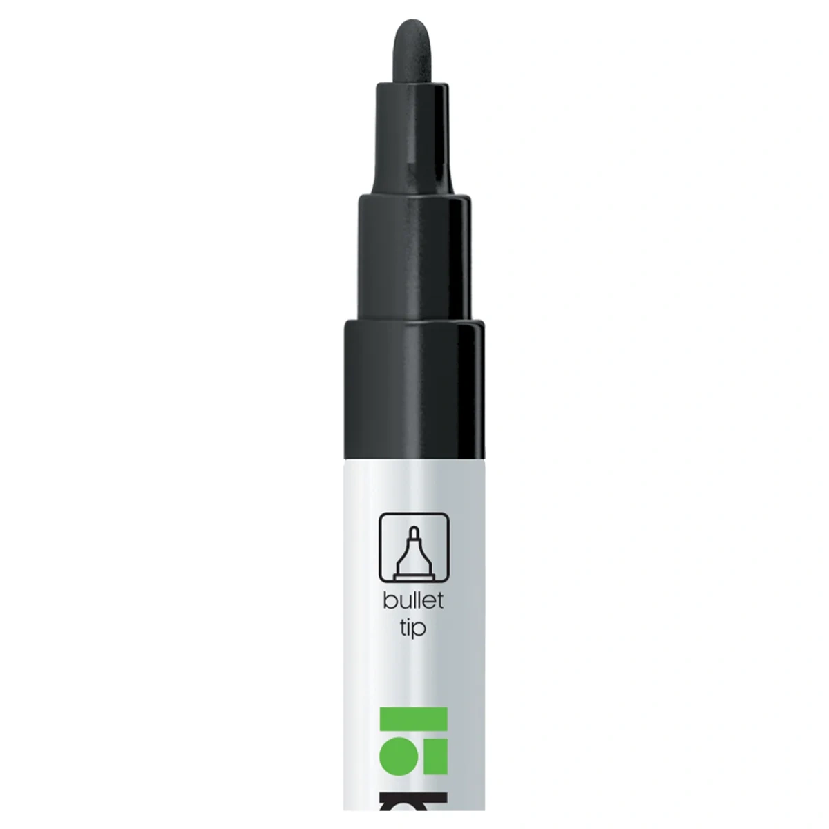 Закруглённый пишущий узел. Ширина линии - 2 мм. Длина непрерывной линии - 300 м. Используется для работы на металлических, деревянных, стеклянных и пластиковых поверхностях. Упакованы в картонный мини-дисплей по 12 штук.