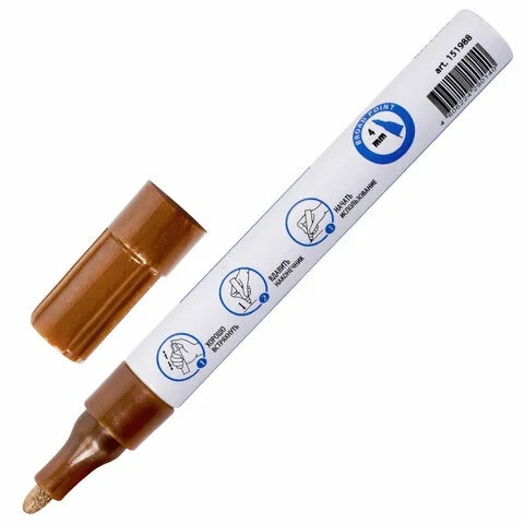 Высококачественные чернила медного цвета с лаковым эффектом идеально подходят для нанесения долговечной маркировки на любые поверхности. Благодаря усиленной формуле чернил краска ложится ровным слоем, полностью закрашивая поверхность. С помощью круглого прочного наконечника, выполненного из пористого акрила с шириной линии письма 4 мм, можно легко наносить широкие линии. Быстросохнущие чернила предотвращают смазывание в процессе маркировки. После высыхания надписи становятся термо- и водостойкими, а также устойчивыми к выцветанию и механическому истиранию. Отлично подходит для маскировки бытовых дефектов, таких как царапины и сколы. Надежный помповый механизм подачи чернил предотвращает вытекание и разбрызгивание в процессе использования, а также преждевременное высыхание. Корпус маркера выполнен из алюминия, внутри находятся 2 металлических шарика для взбалтывания краски. Цвет колпачка соответствует цвету чернил.