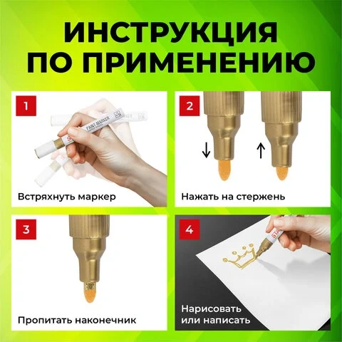 Высококачественные чернила золотистого цвета с лаковым эффектом идеально подходят для нанесения долговечной маркировки на любые поверхности. Благодаря усиленной формуле чернил краска ложится ровным слоем, полностью закрашивая поверхность. С помощью круглого прочного наконечника, выполненного из пористого акрила с шириной линии письма 2-4 мм, можно легко наносить широкие линии равномерным и однородным слоем.