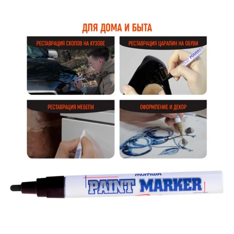 Маркер чёрного цвета — это профессиональный лаковый маркер на нитрооснове, предназначенный для использования на различных поверхностях, таких как металл, дерево, пластик, камень, бетон, стекло, резина и кожа. Он идеально подходит для реставрации дефектов на бытовой технике, обуви, кузовах автомобилей, а также для создания надписей и рисунков на каменных плитах.