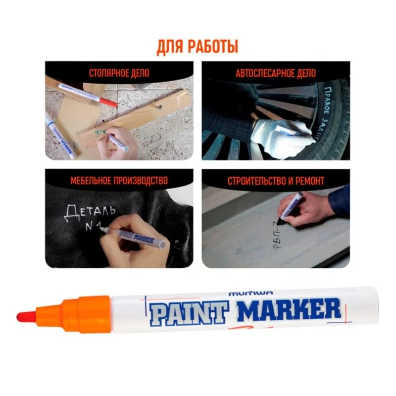 Промышленный лаковый маркер на нитрокраской основе предназначен для нанесения ярких и стойких надписей и рисунков на различных поверхностях, таких как металл, дерево, резина, бетон, стекло, кожа, камень и пластик. Он идеально подходит для реставрации бытовой техники, автомобильных кузовов, а также для оформления и декорирования различных объектов, включая каменные плиты и другие твёрдые материалы.