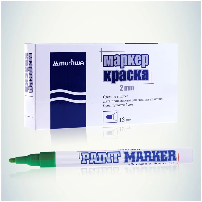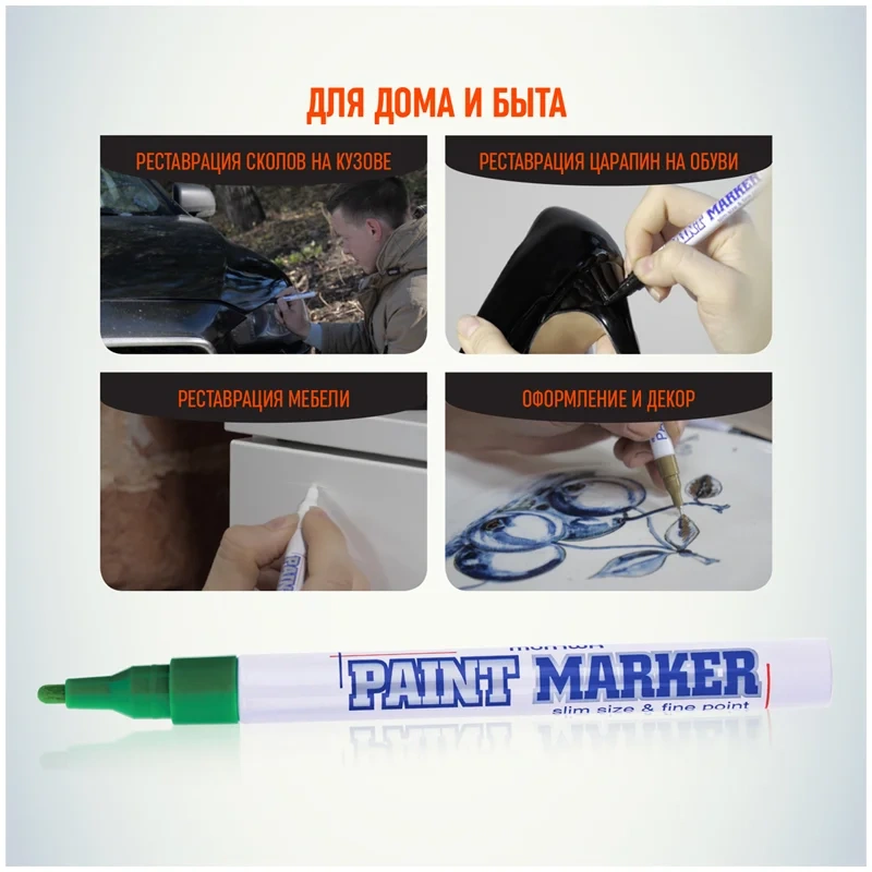 Paint Marker подходит для реставрации дефектов на бытовой технике, обуви, кузове автомобиля, а также надписей на каменных плитах. Маркер-краска MunHwa имеет широкое применения в дизайне, декорировании и оформлении.
