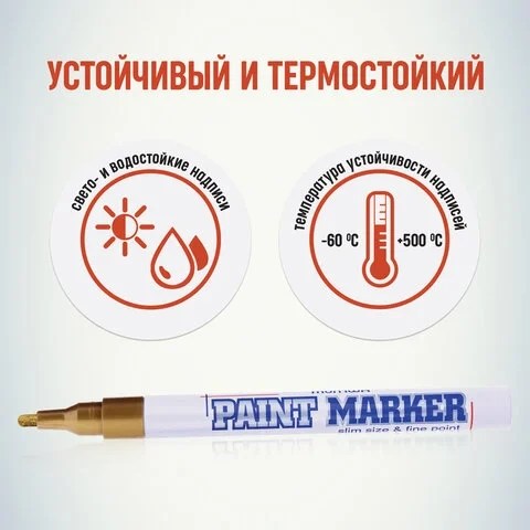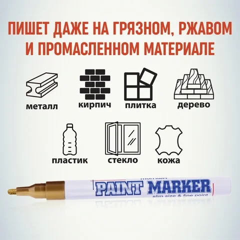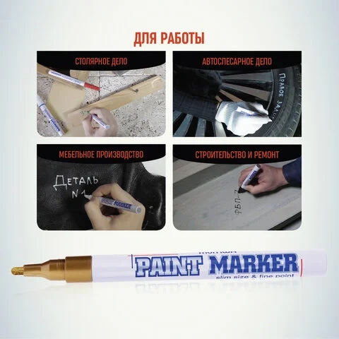 Маркер-краска предназначен для нанесения стойких и чётких маркировок на различных материалах, таких как металл, дерево, резина, стекло, камень, кожа, пластик и бетон. Этот лаковый маркер на нитрооснове идеально подходит для реставрации дефектов на бытовой технике, обуви, кузове автомобиля, а также для создания надписей на каменных плитах.