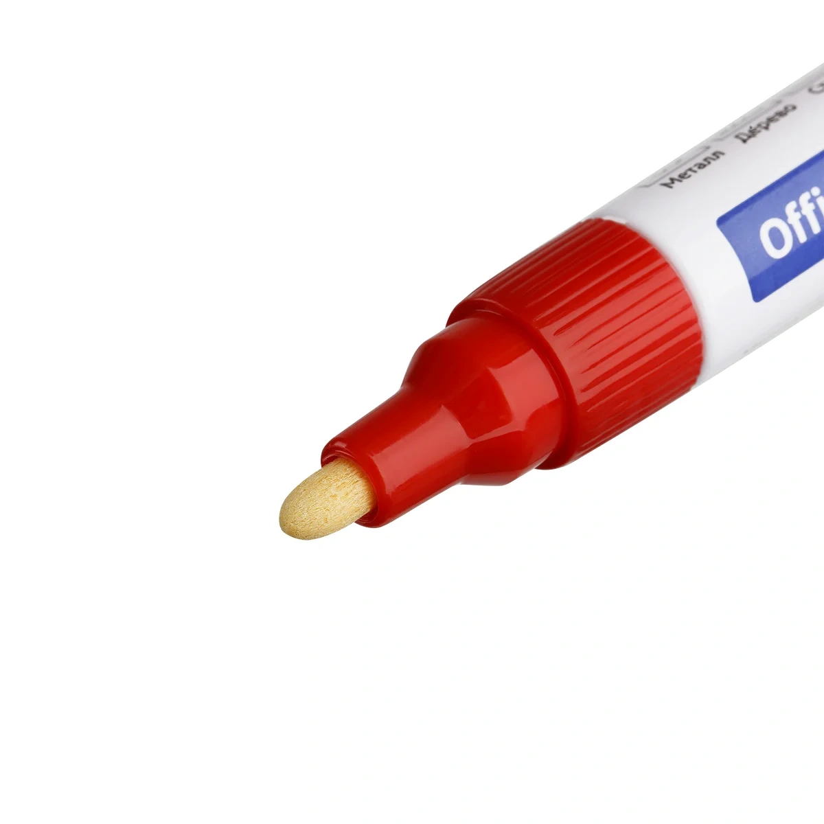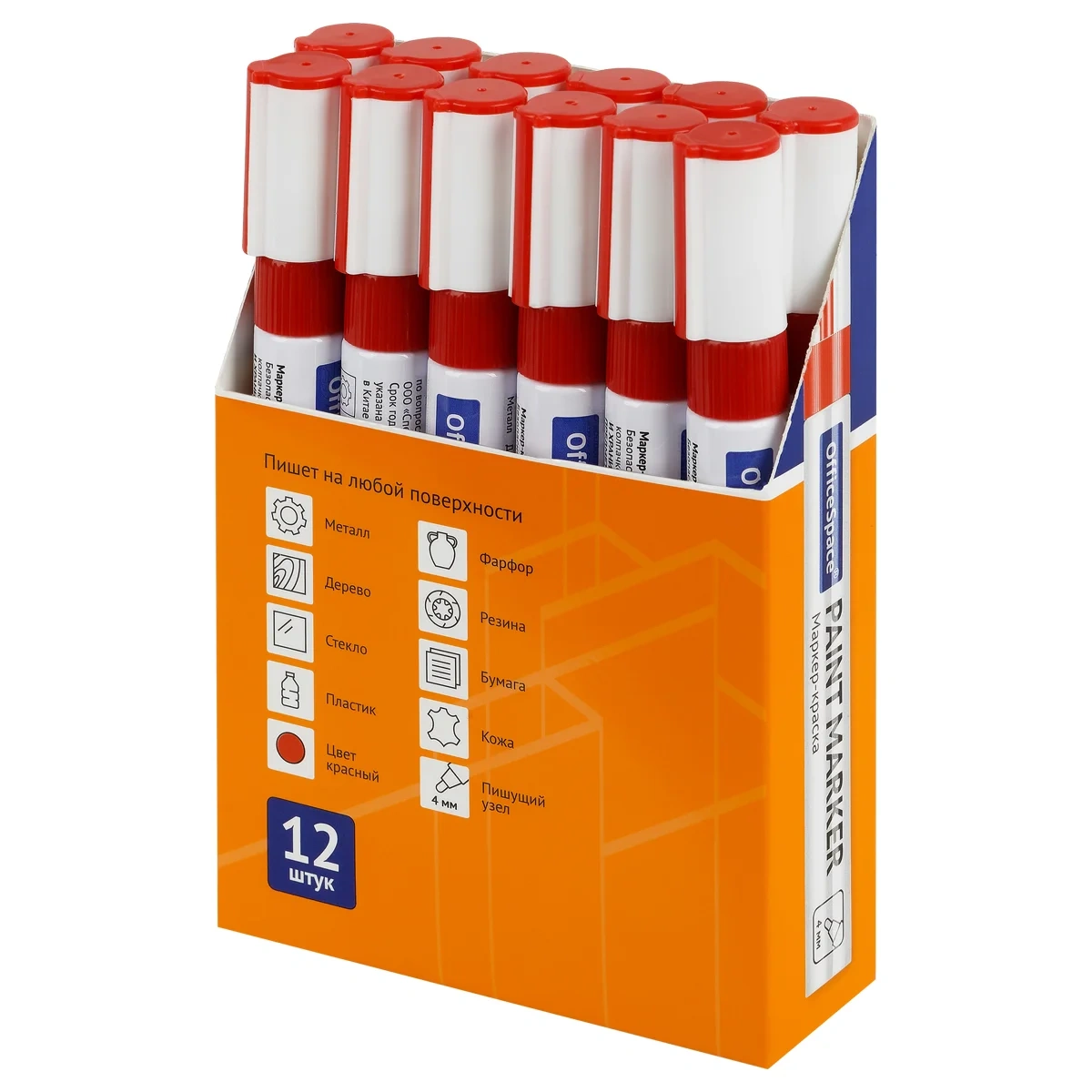 Маркер-краска OfficeSpace с чернилами на нитро-основе подходит для использования на металлических, деревянных, стеклянных и пластиковых поверхностях. Цвет – красный. Закругленный пишущий узел оставляет линии шириной 1-4 мм. Длина непрерывной линии – 380 метров. Металлический корпус. Маркеры упакованы по 12 штук в картонную коробку, которую можно использовать в качестве мини-витрины.