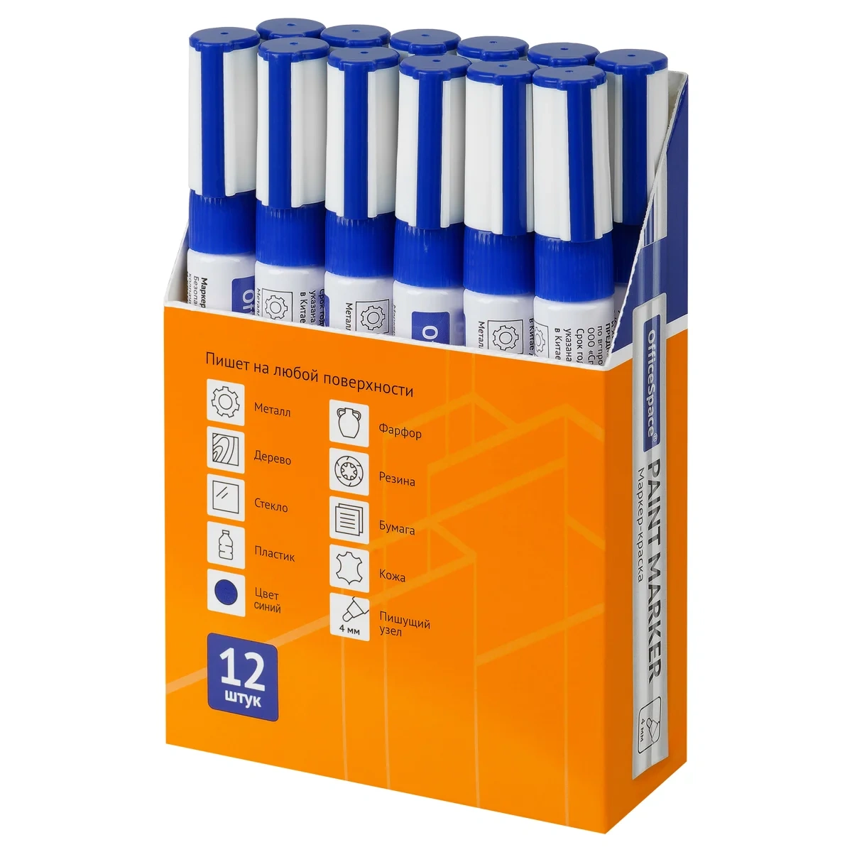 Маркер-краска OfficeSpace с чернилами на нитро-основе подходит для использования на металлических, деревянных, стеклянных и пластиковых поверхностях. Цвет – синий. Закругленный пишущий узел оставляет линии шириной 1-4 мм. Длина непрерывной линии – 380 метров. Металлический корпус. Маркеры упакованы по 12 штук в картонную коробку, которую можно использовать в качестве мини-витрины.
