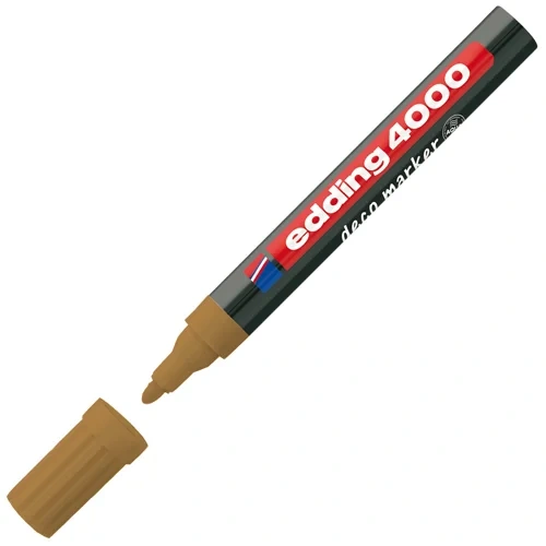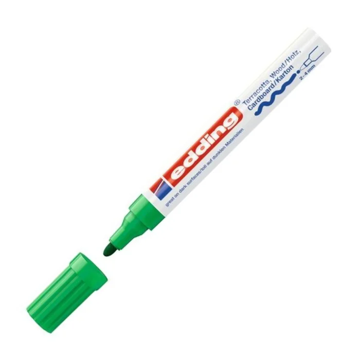Матовый лаковый маркер Edding E-4000 CR для шелковисто-матового оформления различных пористых и темных поверхностей. Оптимален для керамики, картона и древесины. Водостойкие чернила зеленого цвета с лакирующим эффектом не имеют запаха, не подвержены воздействию окружающей среды, отличаются высокой светостойкостью. Поток чернил регулируется клапаном. Толщина линии письма — 2–4 мм. Для активации маркер необходимо встряхнуть, снять колпачок, поставить наконечником на поверхность и подкачать, осторожно нажимая на наконечник. После использования требуется плотно надеть колпачок.