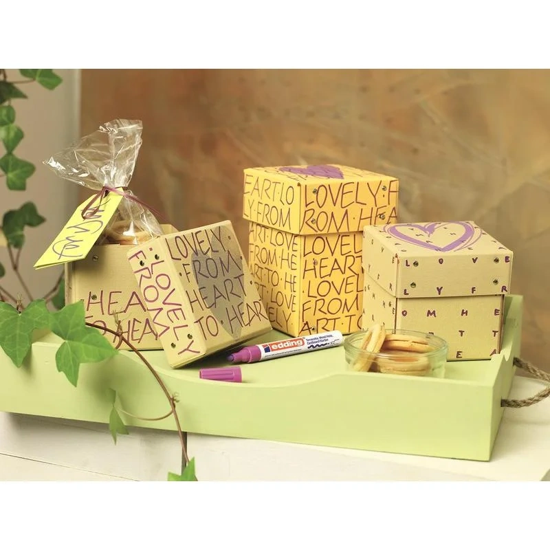 Матовый лаковый маркер Edding E-4040 CR для шелковисто-матового оформления различных пористых и темных поверхностей. Оптимален для керамики, картона и древесины. Водостойкие чернила фиолетового цвета с лакирующим эффектом не имеют запаха, не подвержены воздействию окружающей среды, отличаются высокой светостойкостью. Поток чернил регулируется клапаном. Толщина линии письма — 1 –2 мм. Для активации маркер необходимо встряхнуть, снять колпачок, поставить наконечником на поверхность и подкачать, осторожно нажимая на наконечник. После использования требуется плотно надеть колпачок.
