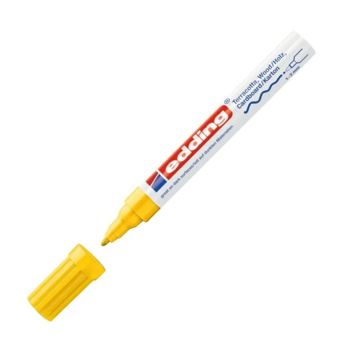 Матовый лаковый маркер Edding E-4040 CR для шелковисто-матового оформления различных пористых и темных поверхностей. Оптимален для керамики, картона и древесины. Водостойкие чернила желтого цвета с лакирующим эффектом не имеют запаха, не подвержены воздействию окружающей среды, отличаются высокой светостойкостью. Поток чернил регулируется клапаном. Толщина линии письма — 1–2 мм. Для активации маркер необходимо встряхнуть, снять колпачок, поставить наконечником на поверхность и подкачать, осторожно нажимая на наконечник. После использования требуется плотно надеть колпачок.