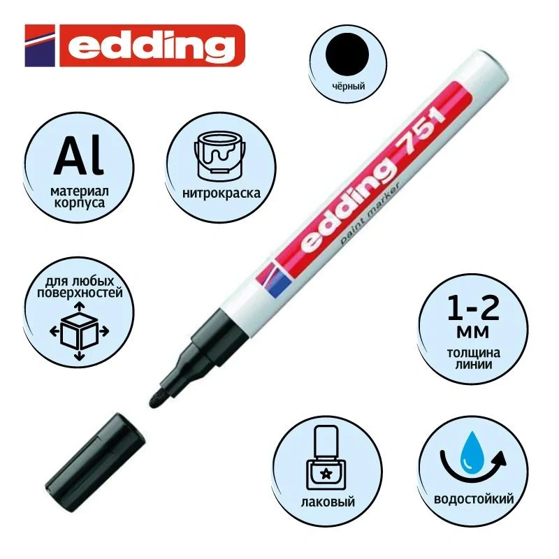 Маркер лаковый перманентный Edding 751 чёрный, 1-2мм, круглый наконечник, универсальный