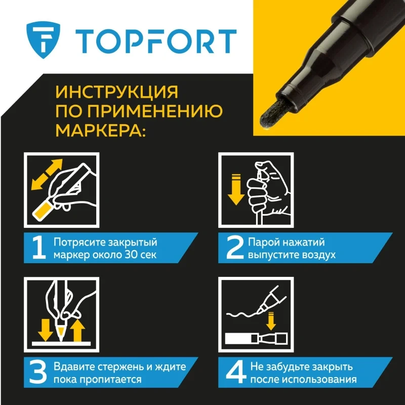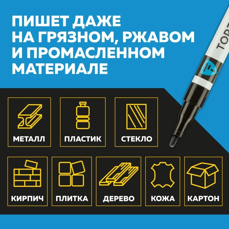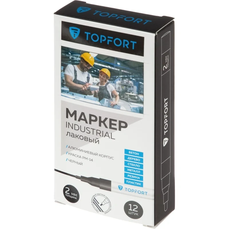Маркер промышленный TOPFORT Industrial для универсальной маркировки черный (2 мм) предназначен для промышленной непрозрачной маркировки металла, стекла, пластика, дерева, резины, камня, картона, кирпича, текстиля, кожи (материал), бумаги, бетона. Краска содержит высококонцентрированный пигмент, хорошо ложится на гладкие и шероховатые поверхности. Может применяться для письма на жирных, пыльных, грязных поверхностях. После высыхания лаковые чернила устойчивы к воздействию света, атмосферных осадков, смазочных материалов, механическому истиранию. Создает стойкую линию толщиной 2 мм. Длина маркера - 130 мм. Цвет чернил : черный. Особенности: - Краска на усиленной нитро-основе РМ-14 (Великобритания). Без ксилола и толуола. - Устойчивый к износу усиленный акриловый круглый наконечник (Япония). - Толщина линии 2 мм. - Материал корпуса - алюминий. - Температурный режим использования : от 0 до +40 С. - Температурный режим хранения: от 0 до +60 С. - Температурная устойчивость надписи: от -60 до +350 С. Инструкция по применению: 1. Перед использованием интенсивно встряхните маркер с закрытым колпачком. 2. Снимите колпачок, прижмите наконечник к поверхности, надавите до упора и удерживайте пока не проступит краска. 3. Применять после того как убедитесь, что наконечник полностью пропитан краской исходного цвета. Избегайте чрезмерного давления на наконечник при дальнейшем использовании. Предостережения: плотно закрывайте колпачок после применения, держать маркер вдали от источников тепла и воспламенения.