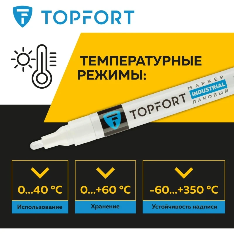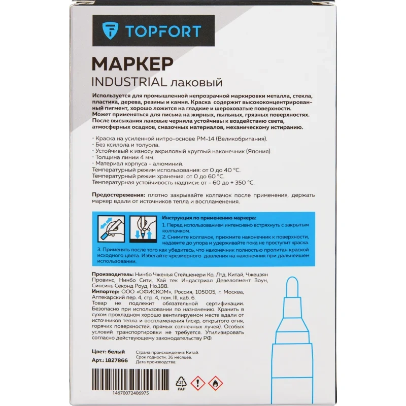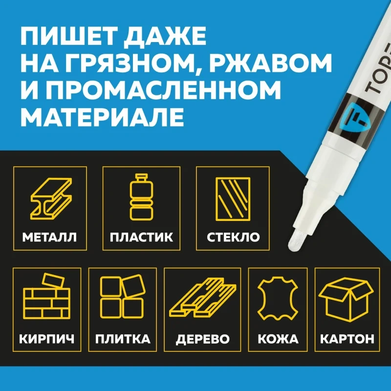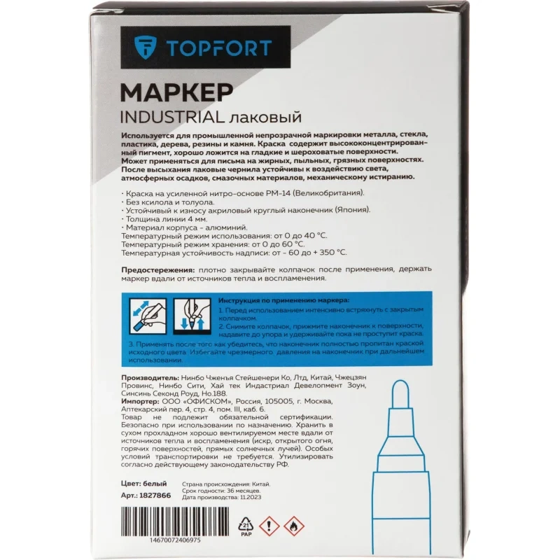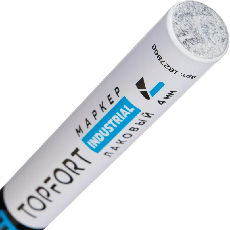 Маркер промышленный TOPFORT Industrial для универсальной маркировки белый (4 мм) предназначен для промышленной непрозрачной маркировки металла, стекла, пластика, дерева, резины, камня, картона, кирпича, текстиля, кожи (материал), бумаги, бетона. Краска содержит высококонцентрированный пигмент, хорошо ложится на гладкие и шероховатые поверхности. Может применяться для письма на жирных, пыльных, грязных поверхностях. После высыхания лаковые чернила устойчивы к воздействию света, атмосферных осадков, смазочных материалов, механическому истиранию. Создает стойкую линию толщиной 4 мм. Длина маркера - 143 мм. Цвет чернил : белый. Особенности: - Краска на усиленной нитро-основе РМ-14 (Великобритания). Без ксилола и толуола. - Устойчивый к износу усиленный акриловый круглый наконечник (Япония). - Толщина линии 4 мм. - Материал корпуса - алюминий. - Температурный режим использования : от 0 до +40 С. - Температурный режим хранения: от 0 до +60 С. - Температурная устойчивость надписи: от -60 до +350 С. Инструкция по применению: 1. Перед использованием интенсивно встряхните маркер с закрытым колпачком. 2. Снимите колпачок, прижмите наконечник к поверхности, надавите до упора и удерживайте пока не проступит краска. 3. Применять после того как убедитесь, что наконечник полностью пропитан краской исходного цвета. Избегайте чрезмерного давления на наконечник при дальнейшем использовании. Предостережения: плотно закрывайте колпачок после применения, держать маркер вдали от источников тепла и воспламенения.