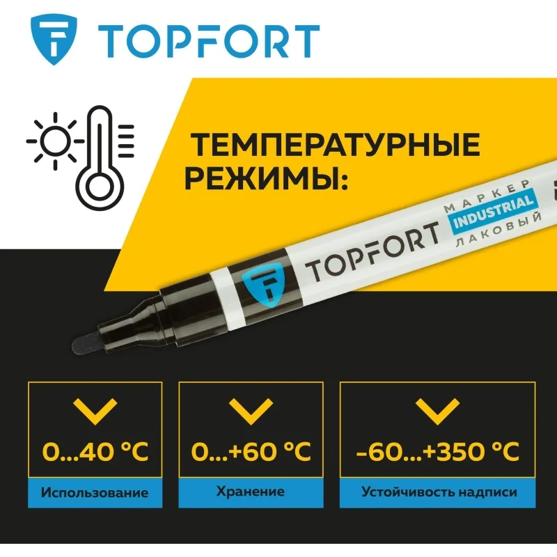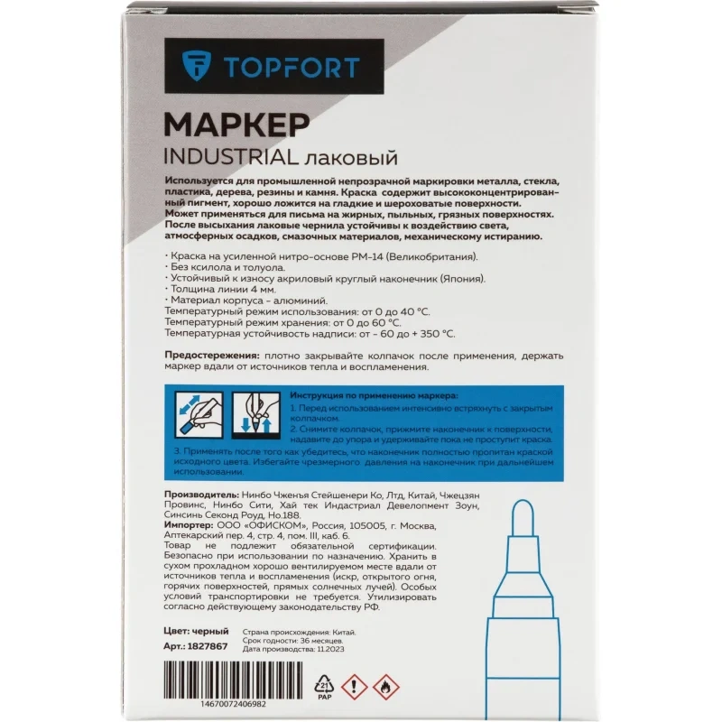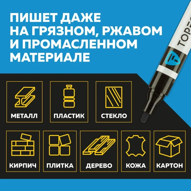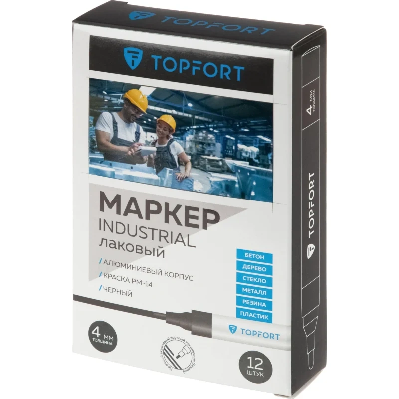 Маркер промышленный TOPFORT Industrial для универсальной маркировки черный (4 мм) предназначен для промышленной непрозрачной маркировки металла, стекла, пластика, дерева, резины, камня, картона, кирпича, текстиля, кожи (материал), бумаги, бетона. Краска содержит высококонцентрированный пигмент, хорошо ложится на гладкие и шероховатые поверхности. Может применяться для письма на жирных, пыльных, грязных поверхностях. После высыхания лаковые чернила устойчивы к воздействию света, атмосферных осадков, смазочных материалов, механическому истиранию. Создает стойкую линию толщиной 4 мм. Длина маркера - 143 мм. Цвет чернил : черный. Особенности: - Краска на усиленной нитро-основе РМ-14 (Великобритания). Без ксилола и толуола. - Устойчивый к износу усиленный акриловый круглый наконечник (Япония). - Толщина линии 4 мм. - Материал корпуса - алюминий. - Температурный режим использования : от 0 до +40 С. - Температурный режим хранения: от 0 до +60 С. - Температурная устойчивость надписи: от -60 до +350 С. Инструкция по применению: 1. Перед использованием интенсивно встряхните маркер с закрытым колпачком. 2. Снимите колпачок, прижмите наконечник к поверхности, надавите до упора и удерживайте пока не проступит краска. 3. Применять после того как убедитесь, что наконечник полностью пропитан краской исходного цвета. Избегайте чрезмерного давления на наконечник при дальнейшем использовании. Предостережения: плотно закрывайте колпачок после применения, держать маркер вдали от источников тепла и воспламенения.