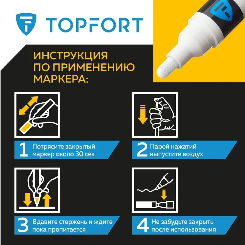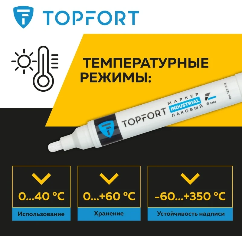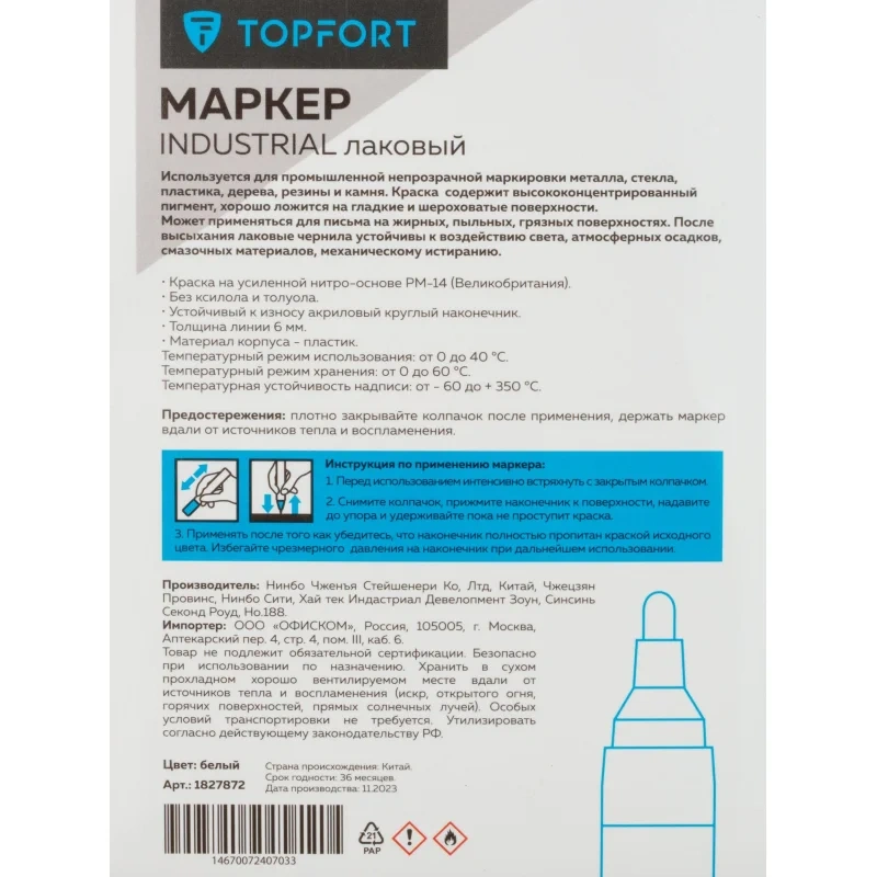 Маркер промышленный TOPFORT Industrial для универсальной маркировки белый (6 мм) предназначен для промышленной непрозрачной маркировки металла, стекла, пластика, дерева, резины, камня, картона, кирпича, текстиля, кожи (материал), бумаги, бетона. Краска содержит высококонцентрированный пигмент, хорошо ложится на гладкие и шероховатые поверхности. Может применяться для письма на жирных, пыльных, грязных поверхностях. После высыхания лаковые чернила устойчивы к воздействию света, атмосферных осадков, смазочных материалов, механическому истиранию. Создает стойкую линию толщиной 6 мм. Длина маркера - 142 мм. Цвет чернил : белый. Особенности: - Краска на усиленной нитро-основе РМ-14 (Великобритания). Без ксилола и толуола. - Устойчивый к износу усиленный акриловый круглый наконечник (Япония). - Толщина линии 6 мм. - Материал корпуса - алюминий. - Температурный режим использования : от 0 до +40 С. - Температурный режим хранения: от 0 до +60 С. - Температурная устойчивость надписи: от -60 до +350 С. Инструкция по применению: 1. Перед использованием интенсивно встряхните маркер с закрытым колпачком. 2. Снимите колпачок, прижмите наконечник к поверхности, надавите до упора и удерживайте пока не проступит краска. 3. Применять после того как убедитесь, что наконечник полностью пропитан краской исходного цвета. Избегайте чрезмерного давления на наконечник при дальнейшем использовании. Предостережения: плотно закрывайте колпачок после применения, держать маркер вдали от источников тепла и воспламенения.