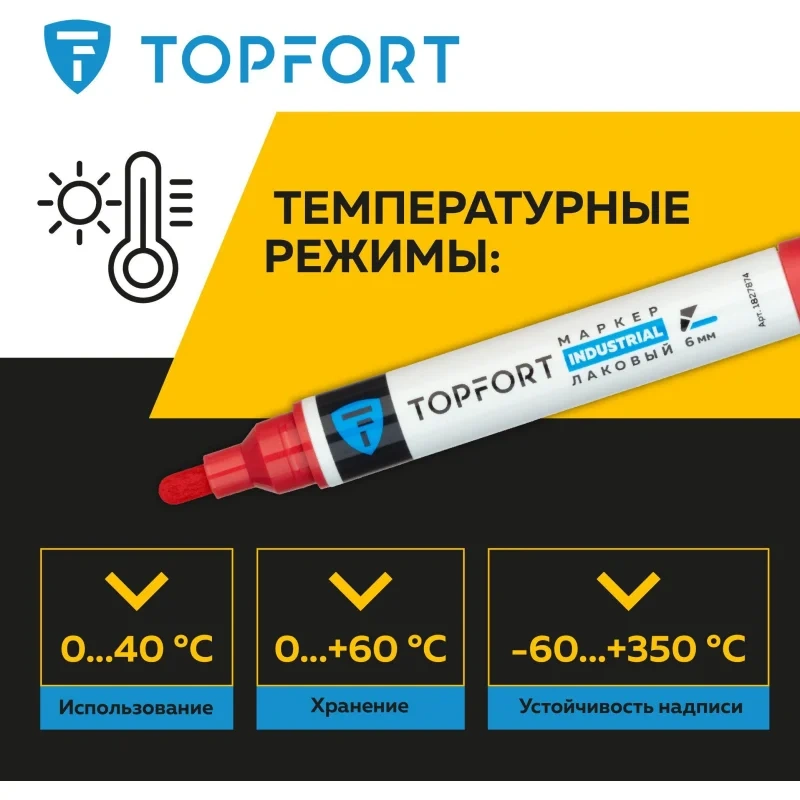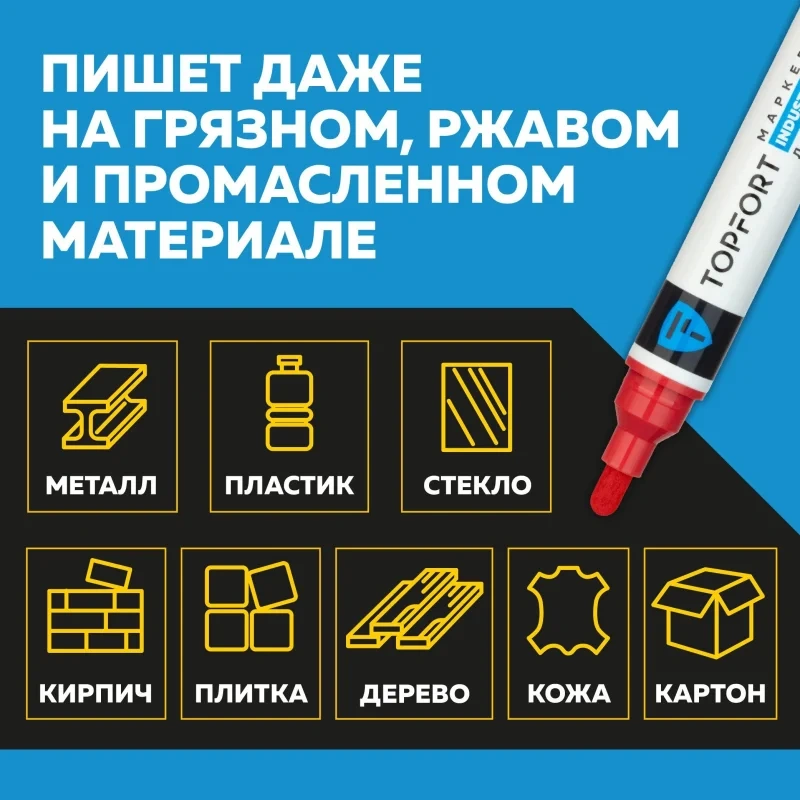 Маркер промышленный TOPFORT Industrial для универсальной маркировки красный (6 мм) предназначен для промышленной непрозрачной маркировки металла, стекла, пластика, дерева, резины, камня, картона, кирпича, текстиля, кожи (материал), бумаги, бетона. Краска содержит высококонцентрированный пигмент, хорошо ложится на гладкие и шероховатые поверхности. Может применяться для письма на жирных, пыльных, грязных поверхностях. После высыхания лаковые чернила устойчивы к воздействию света, атмосферных осадков, смазочных материалов, механическому истиранию. Создает стойкую линию толщиной 6 мм. Длина маркера - 142 мм. Цвет чернил : красный. Особенности: - Краска на усиленной нитро-основе РМ-14 (Великобритания). Без ксилола и толуола. - Устойчивый к износу усиленный акриловый круглый наконечник (Япония). - Толщина линии 6 мм. - Материал корпуса - алюминий. - Температурный режим использования : от 0 до +40 С. - Температурный режим хранения: от 0 до +60 С. - Температурная устойчивость надписи: от -60 до +350 С. Инструкция по применению: 1. Перед использованием интенсивно встряхните маркер с закрытым колпачком. 2. Снимите колпачок, прижмите наконечник к поверхности, надавите до упора и удерживайте пока не проступит краска. 3. Применять после того как убедитесь, что наконечник полностью пропитан краской исходного цвета. Избегайте чрезмерного давления на наконечник при дальнейшем использовании. Предостережения: плотно закрывайте колпачок после применения, держать маркер вдали от источников тепла и воспламенения.