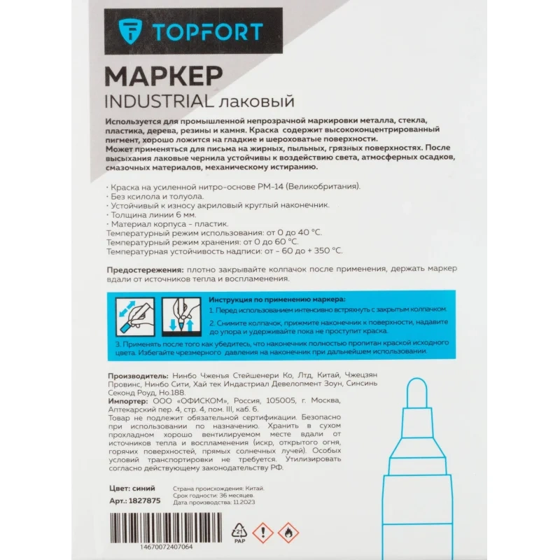 Маркер промышленный TOPFORT Industrial для универсальной маркировки синий (6 мм) предназначен для промышленной непрозрачной маркировки металла, стекла, пластика, дерева, резины, камня, картона, кирпича, текстиля, кожи (материал), бумаги, бетона. Краска содержит высококонцентрированный пигмент, хорошо ложится на гладкие и шероховатые поверхности. Может применяться для письма на жирных, пыльных, грязных поверхностях. После высыхания лаковые чернила устойчивы к воздействию света, атмосферных осадков, смазочных материалов, механическому истиранию. Создает стойкую линию толщиной 6 мм. Длина маркера - 142 мм. Цвет чернил : синий. Особенности: - Краска на усиленной нитро-основе РМ-14 (Великобритания). Без ксилола и толуола. - Устойчивый к износу усиленный акриловый круглый наконечник (Япония). - Толщина линии 6 мм. - Материал корпуса - алюминий. - Температурный режим использования : от 0 до +40 С. - Температурный режим хранения: от 0 до +60 С. - Температурная устойчивость надписи: от -60 до +350 С. Инструкция по применению: 1. Перед использованием интенсивно встряхните маркер с закрытым колпачком. 2. Снимите колпачок, прижмите наконечник к поверхности, надавите до упора и удерживайте пока не проступит краска. 3. Применять после того как убедитесь, что наконечник полностью пропитан краской исходного цвета. Избегайте чрезмерного давления на наконечник при дальнейшем использовании. Предостережения: плотно закрывайте колпачок после применения, держать маркер вдали от источников тепла и воспламенения.